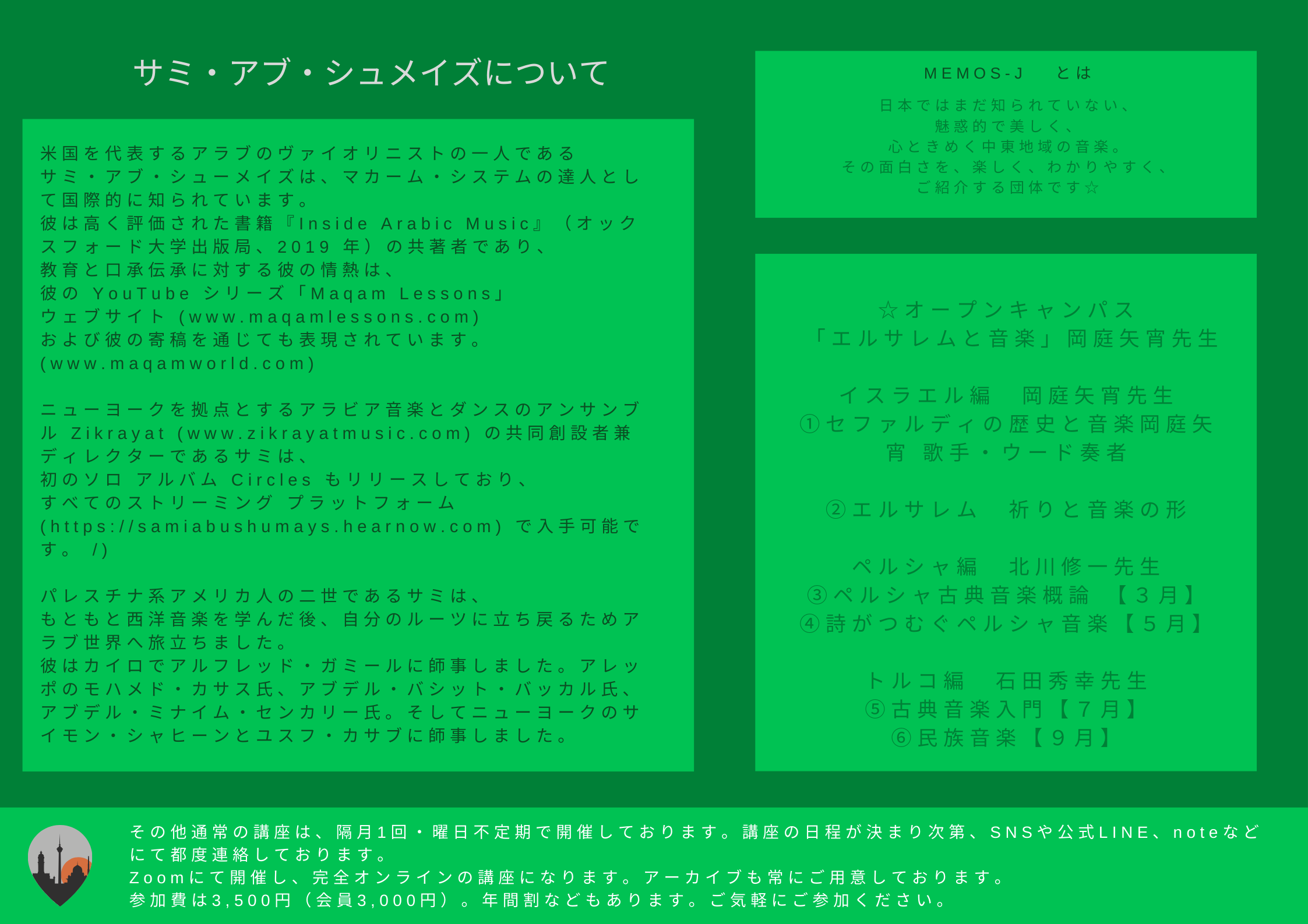 Arabic Maqam workshop with Sami Abu Shumays, presented by memos Japan(with Japanese translation) Sunday, February 11, 2024 9:00 AM 10:30 AM 09:00 10:30 online (map) Google Calendar ICS Online workshop organized by Memos Japan https://note.com/memos_j/n/ncdfd10548195